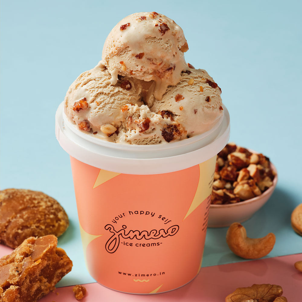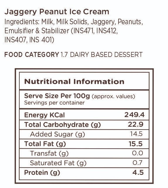 Handmade peanut jaggery (chikki) nougat meets our unique rich creamy organic jaggery ice cream for a truly Indian taste. Enjoy the nutty crunch in this no added sugar ice cream.