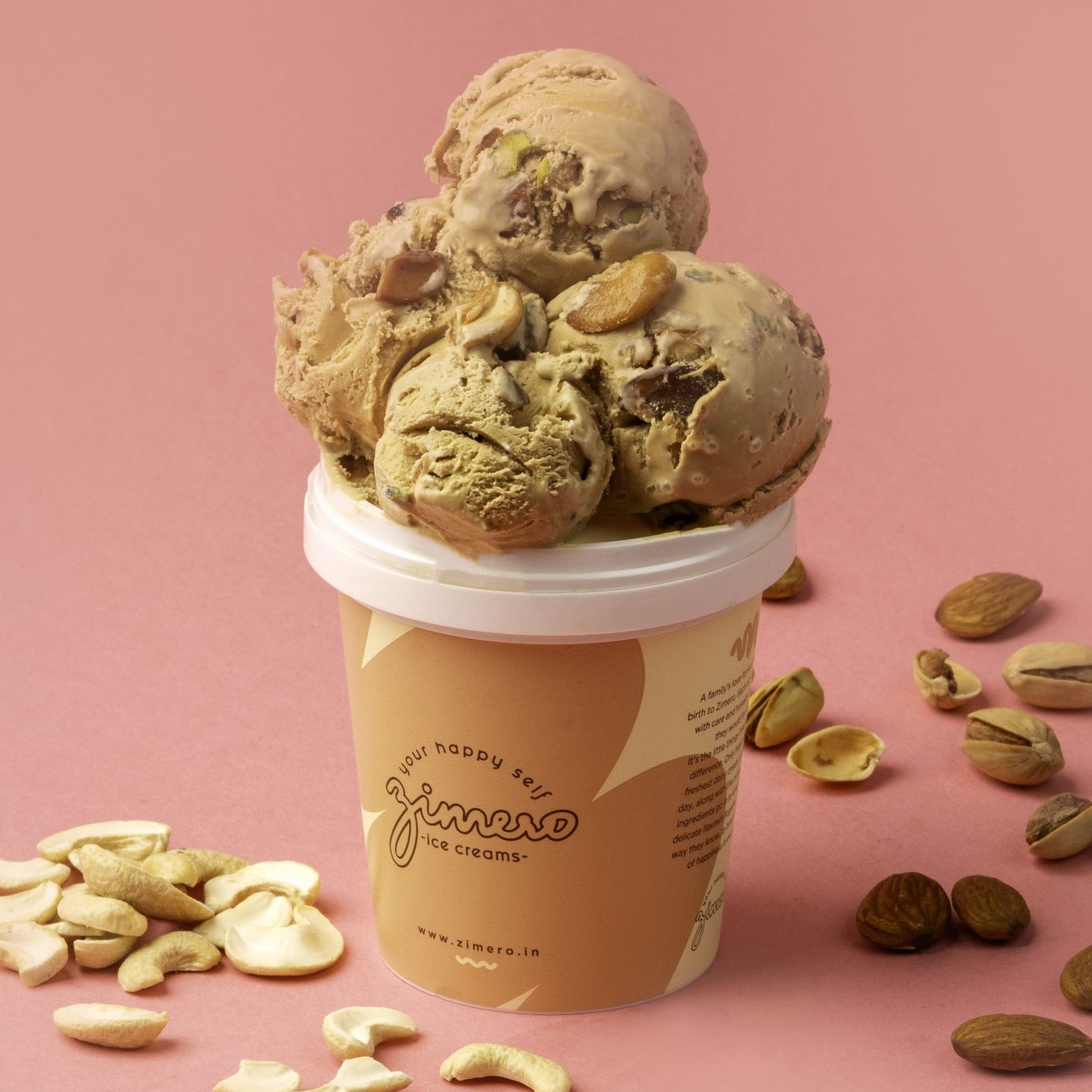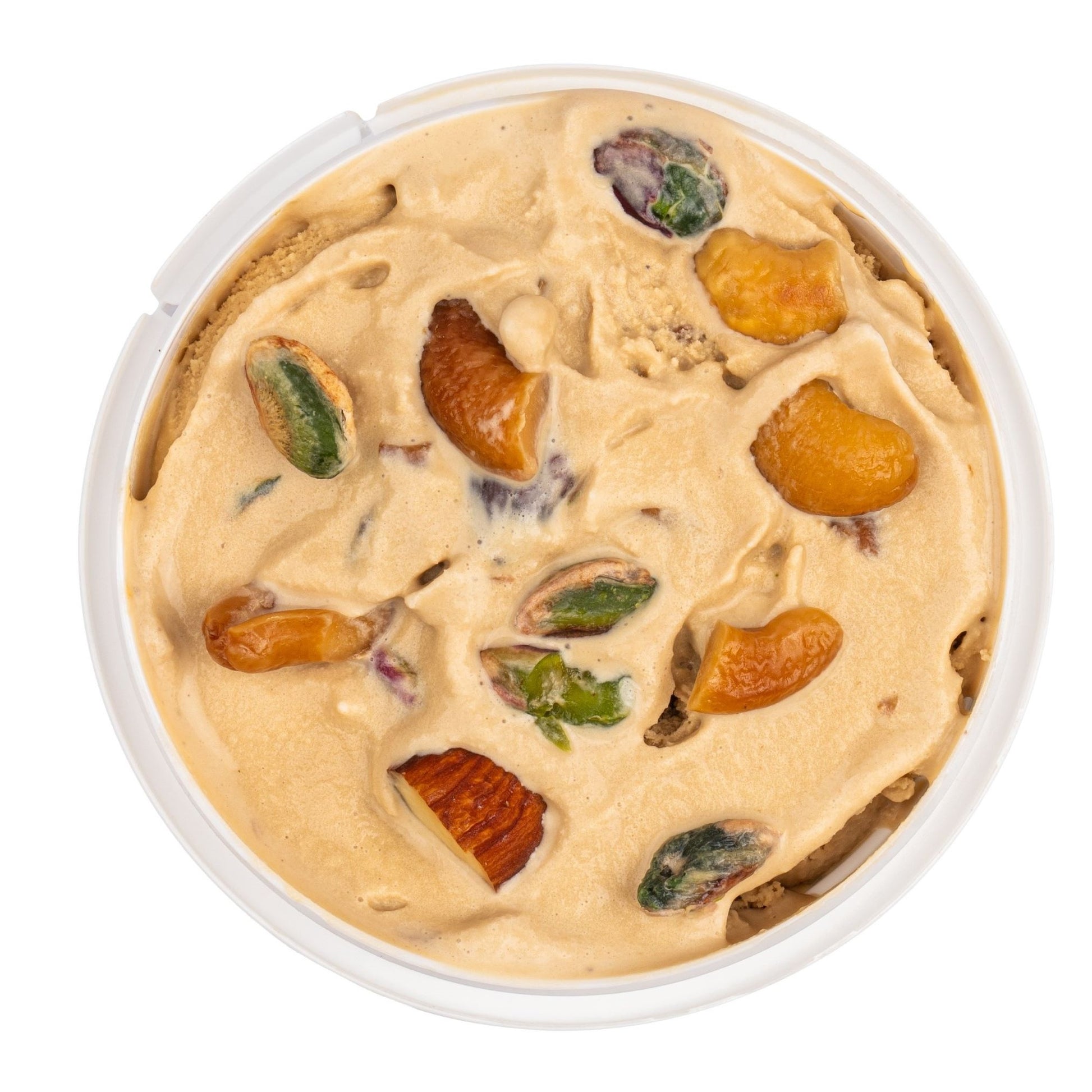Rich creamy ice cream sweetened with 100% organic jaggery and generously loaded with a trio of roasted cashew-nuts, almonds and pistachios. No Sugar!